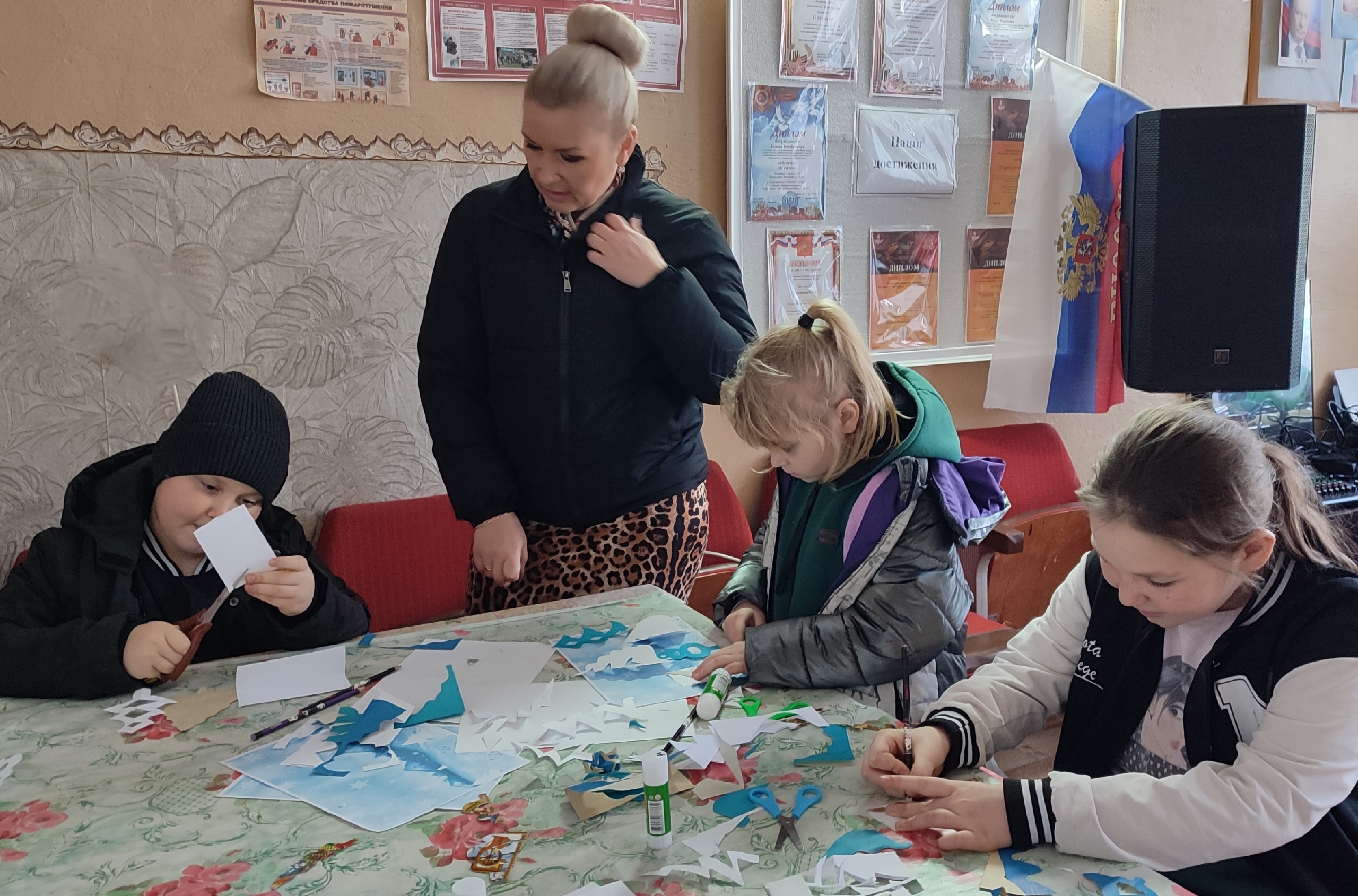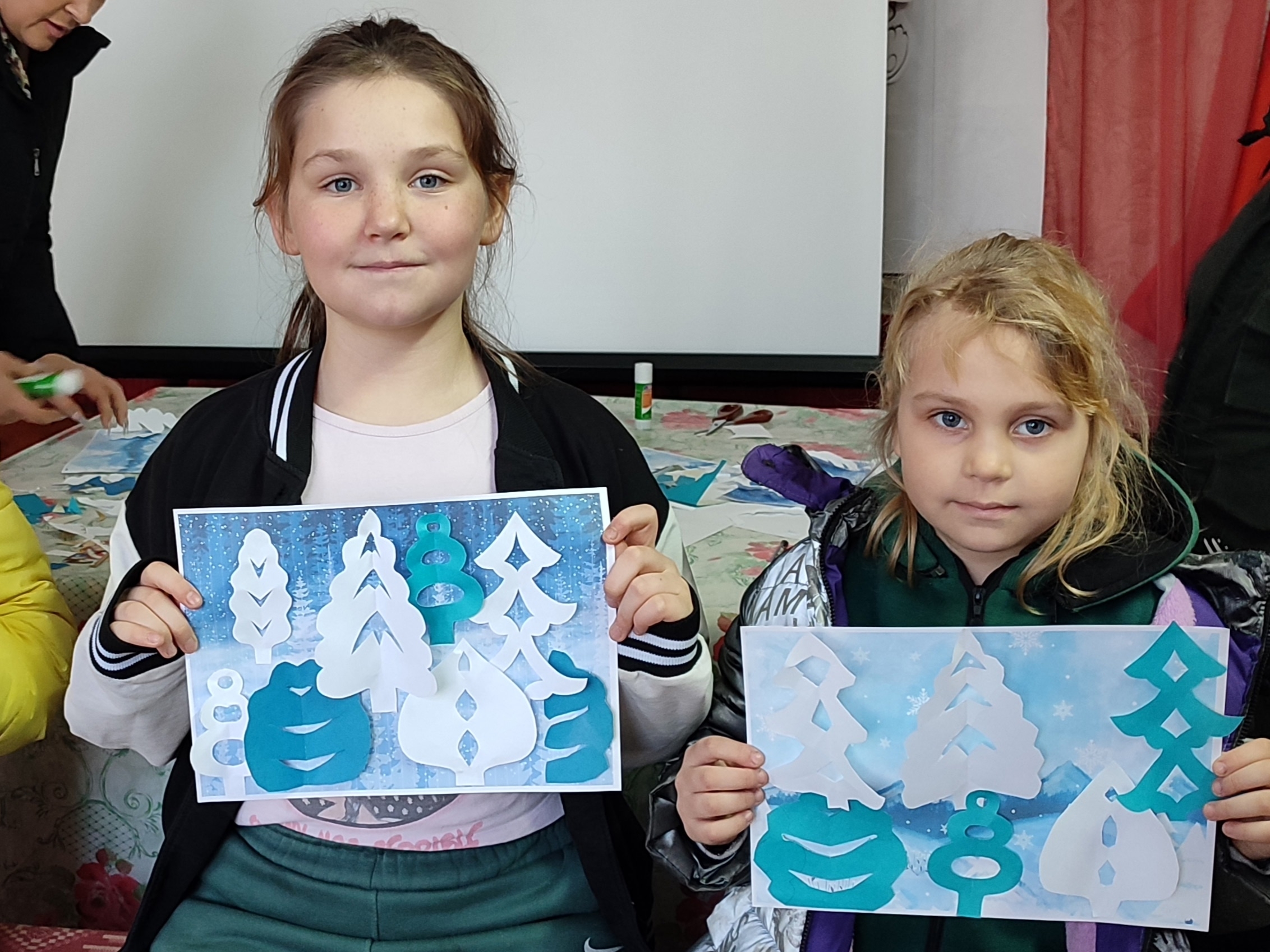 Ребята старательно вырезали силуэты деревьев из белой, голубой и синей бумаги — каждый лист превращался в часть волшебного зимнего леса. Кто‑то работал медленно и аккуратно, кто‑то — быстро и энергично, но все были увлечены процессом.